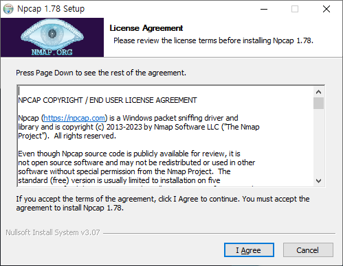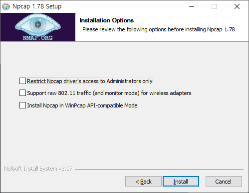 설치 도중 Npcap 설치 화면이 별도로 뜹니다.