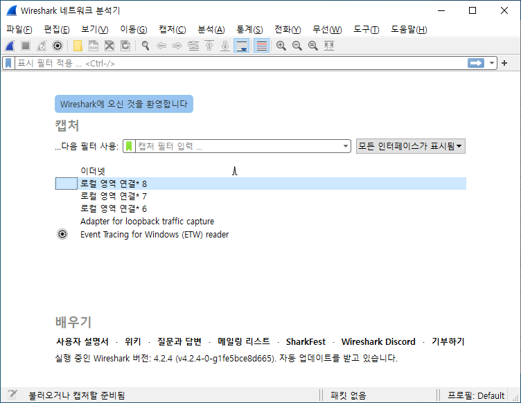 5. 설치된 Wireshark를 실행합니다. (설치 경로 "C:\Program Files\Wireshark\Wireshark.exe" )